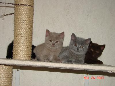 O nás:Jsme malá rodinná chovatelská stanice. Kočičky s námi žijí volně v bytě. Odchováváme koťátka v barvách: černá, modrá, čokoládová, lila a černá a modrá stříbřitá mramorovaná a černá zlatá mramorovaná.