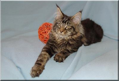 O plemeni:Mainskou mývalí kočku řadíme mezi největší plemena domestikovaných koček. Je to mimořádně krásná kočka, která je známá svou vysokou inteligencí a hravostí. V USA, odkud toto plemeno pochází, se nazývá Main Coon (coon, racoon = mýval), a to podle bohatě osrstěného chundelatého ocasu, který se podobá ocasu mývala. Díky své impozantní velikosti a přátelské povaze se této kočce často přezdívá "něžný obr".