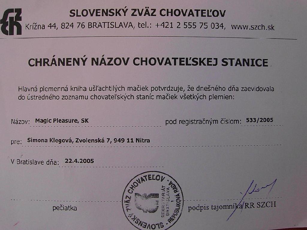 Adresa: Nitra, Zvolenská 7, SR Telefon: +421908605188 Zodpovědná osoba: Simona www: www.magicpleasure.szm.sk Mail: | Reg. číslo CHS: 533/2005 Certifikát CHS: Zobrazit Certifikát ::: Plánujeme vrh: 01.01.1970 Hodnocení: 76 bodů ze 100 |