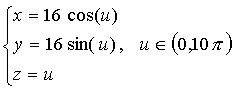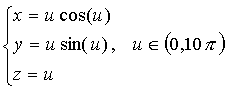 Jeden závit šroubovice na rotační kuželové ploše od 0 do 2 Pi. (Na obrázku 5 závitů)