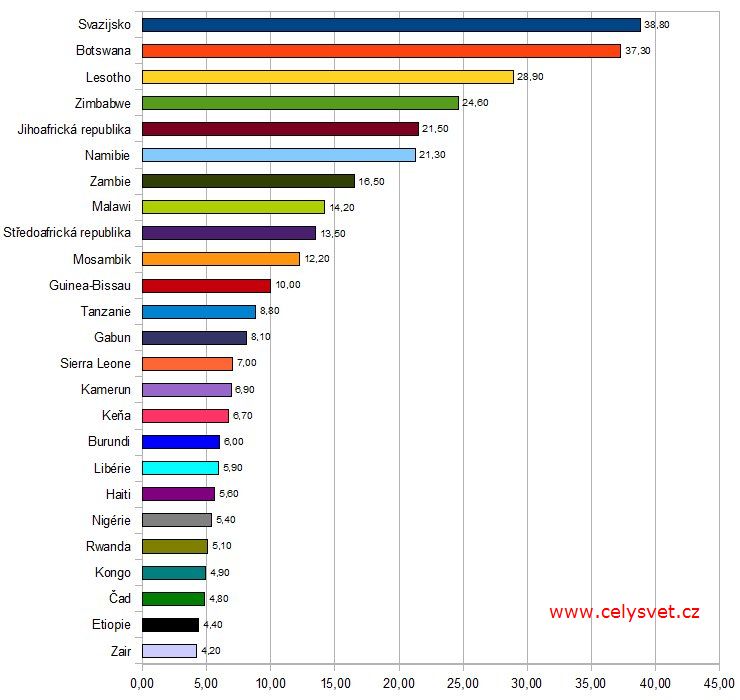 HIV / AIDS - výskyt u dospělých. Pořadí států