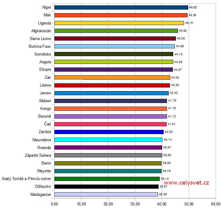 | 1. | Niger ::: | 49.62 dětí na 1000 obyvatel | Vývoj : |